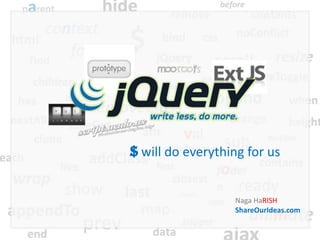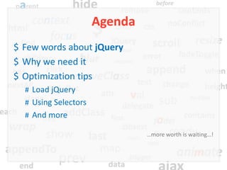 The document discusses jQuery, describing it as a lightweight, cross-browser JavaScript library that simplifies web development tasks such as DOM manipulation, event handling, and animations. It provides optimization tips, best practices for performance, and the use of features like caching and event delegation. Additionally, it highlights the use of content delivery networks for loading jQuery and the advantages of using chaining and data attributes.