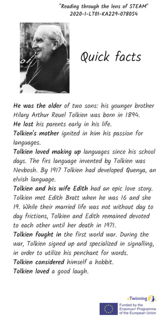 John Ronald Reuel Tolkien was an English writer and scholar best known for his works The Hobbit and The Lord of the Rings trilogy. He was fascinated by languages from a young age and invented many, including those used in his fantasy worlds. After losing both parents as a child, he went on to become a professor and wrote his first stories for his children. The Hobbit and his epic Lord of the Rings trilogy brought him worldwide fame late in life. Tolkien considered storytelling and world-building as important as his scholarly work, drawing inspiration from mythology and language.