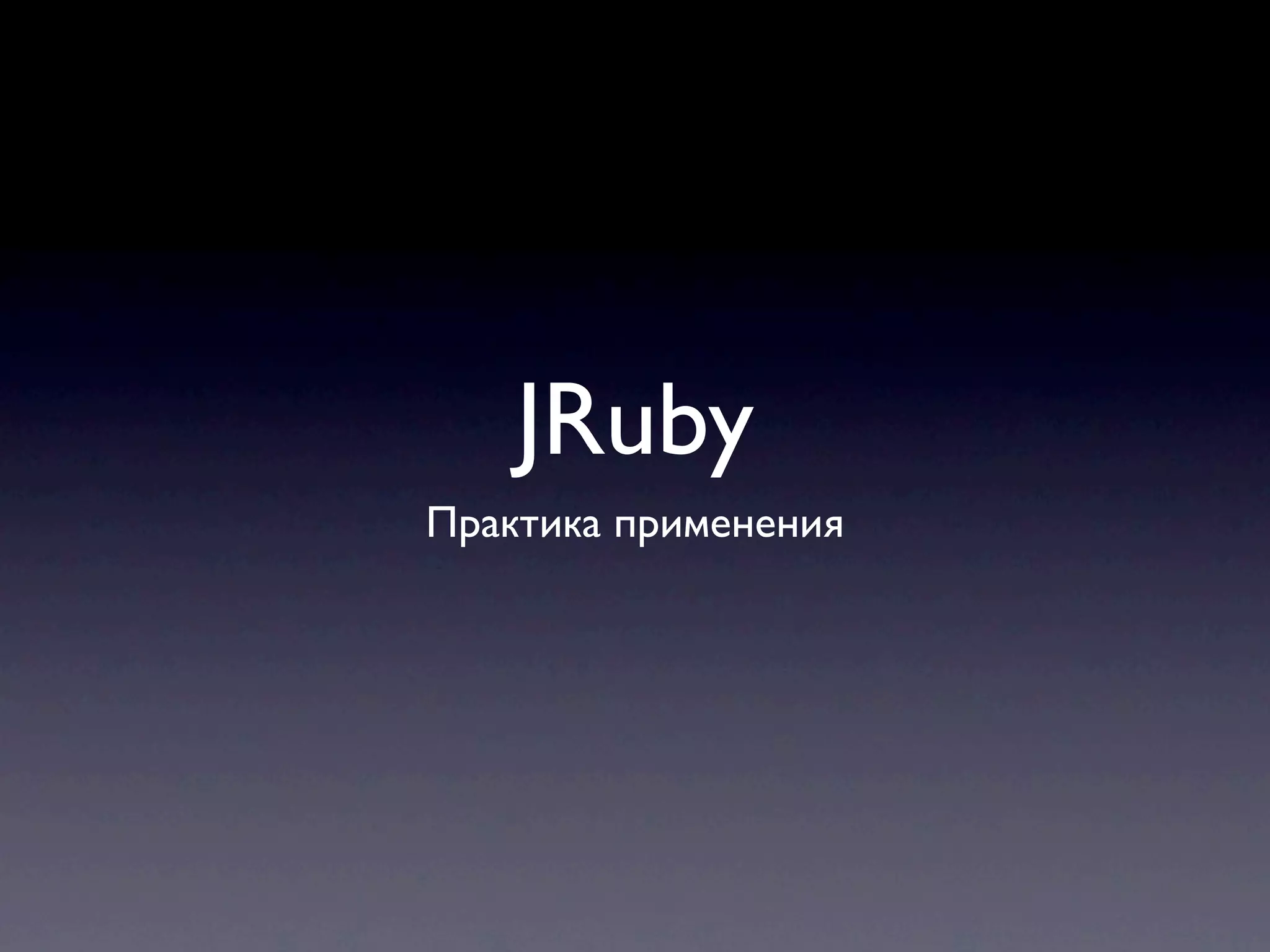 The document provides a brief history of JRuby, beginning with its first version in 2001 and outlining its compatibility with Ruby versions, JVM advantages, and features like multithreading and cross-platform support. It discusses various aspects of JRuby's integration with Java, including installation instructions, libraries, and benchmarks. Additionally, the document highlights various tools and deployment options available for JRuby applications, including web servers and packaging tools.