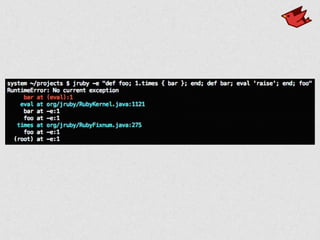 The document discusses challenges in implementing the Ruby programming language on the Java Virtual Machine (JVM) using JRuby. It covers areas like parsing Ruby, implementing different interpreters and compilers, utilizing JVM tricks, ensuring compatibility with features like strings and fibers, and integrating native capabilities. The author also shares decisions they have made around these challenges and future work.