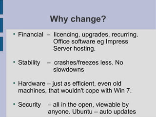 This document discusses some of the advantages and disadvantages of introducing Linux into systems that previously used Windows. It outlines higher stability, lower costs, and improved security as potential benefits of Linux. However, it also notes learning curves for users accustomed to Windows and potential compatibility issues. The document provides guidance on setting up a Linux development environment, including compilers, debuggers, version control through Subversion, and recommendations for hosting Subversion repositories. It encourages taking a cautious, business-driven approach to any transition.