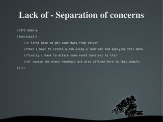 1) Lack of separation of concerns where modules take on too many responsibilities like fetching data, rendering DOM elements, and attaching event handlers.