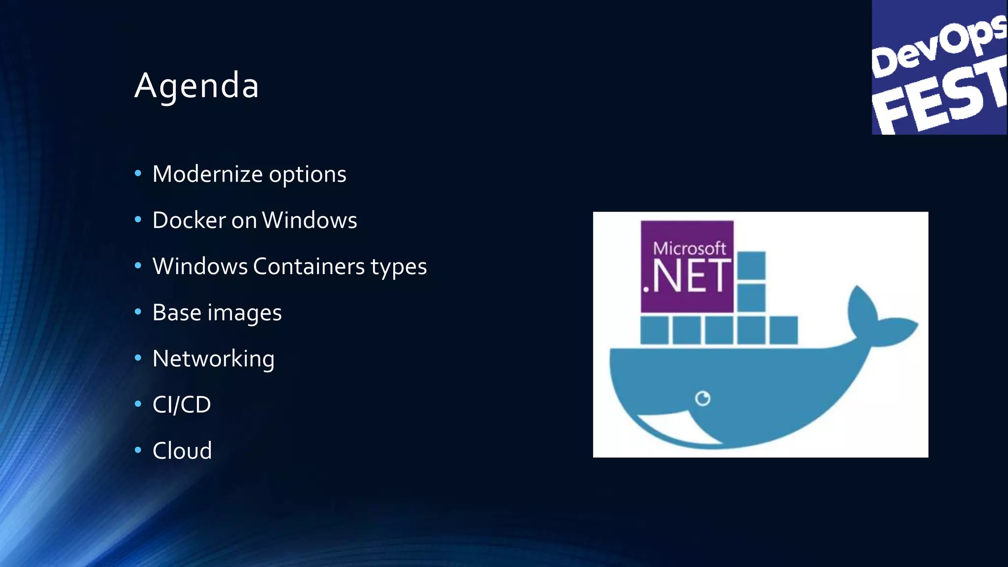 The document discusses Windows containers and their benefits, focusing on modernizing applications and the support provided by Docker on Windows. It outlines various aspects such as container types, base images, networking, CI/CD processes, and cloud use cases involving frameworks like .NET and C++. Furthermore, it highlights compatibility issues, available tools, and the integration of Docker with cloud services, emphasizing the evolving capabilities of Windows containers in software development.