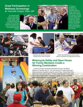 Jefferson Street and Marshall Street employees raised $14,500 for the March of Dimes by participating in a walk/run event despite rain and cool weather. Approximately 85 employees and their families participated. The money raised will help support programs that assist mothers and babies. Dr. Kenneth Cooper also visited the site and spoke to employees about health and wellness. The Jefferson Street Assembly Team volunteered at the North Texas Food Bank by filling food sacks that provided 3,984 meals to needy children. The on-site medical center, open Monday through Friday, can treat many common illnesses and injuries and fill prescriptions under the care of Dr. Wood to help employees until they can see their regular doctors.
