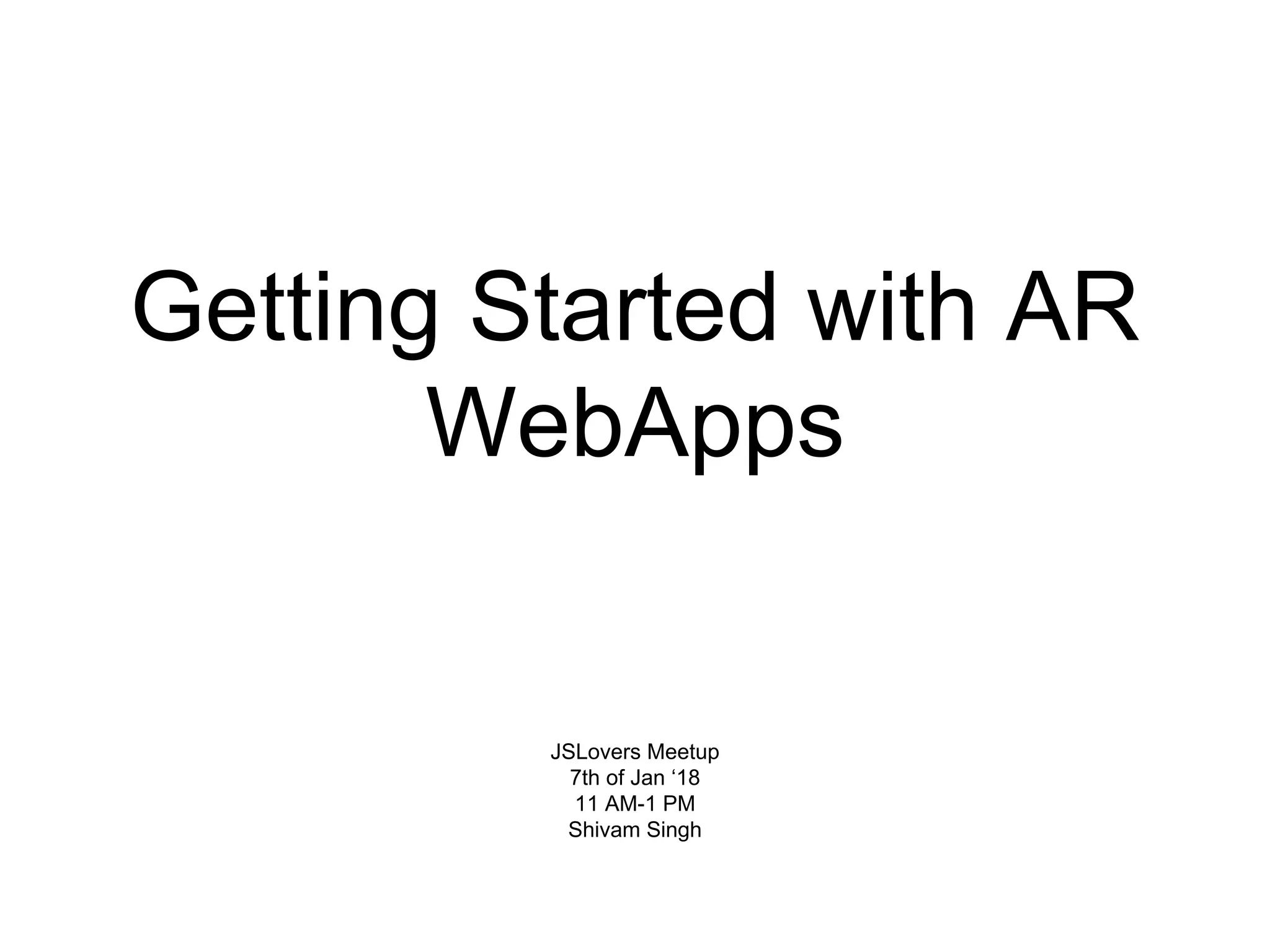 The document outlines the fundamentals of augmented reality (AR) web applications, discussing various AR engines like ARKit and ARCore, and highlighting the use of ARToolKit for mobile-oriented applications. It covers key components such as WebRTC, Three.js for 3D graphics, and different tracking methods for augmented reality markers. The content emphasizes the integration of technology with real-world applications and encourages users to engage actively with their surroundings.