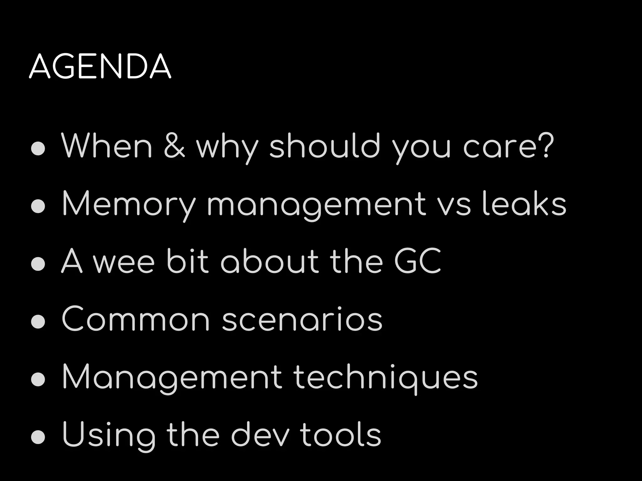 The document discusses JavaScript memory leaks, highlighting their significance in performance management and user experience. It outlines common scenarios of memory leaks, such as unremoved event listeners and excessive concurrent timers, and offers management techniques like lazy loading and memory tracking. The content emphasizes the importance of using developer tools for monitoring memory usage and diagnosing leaks.