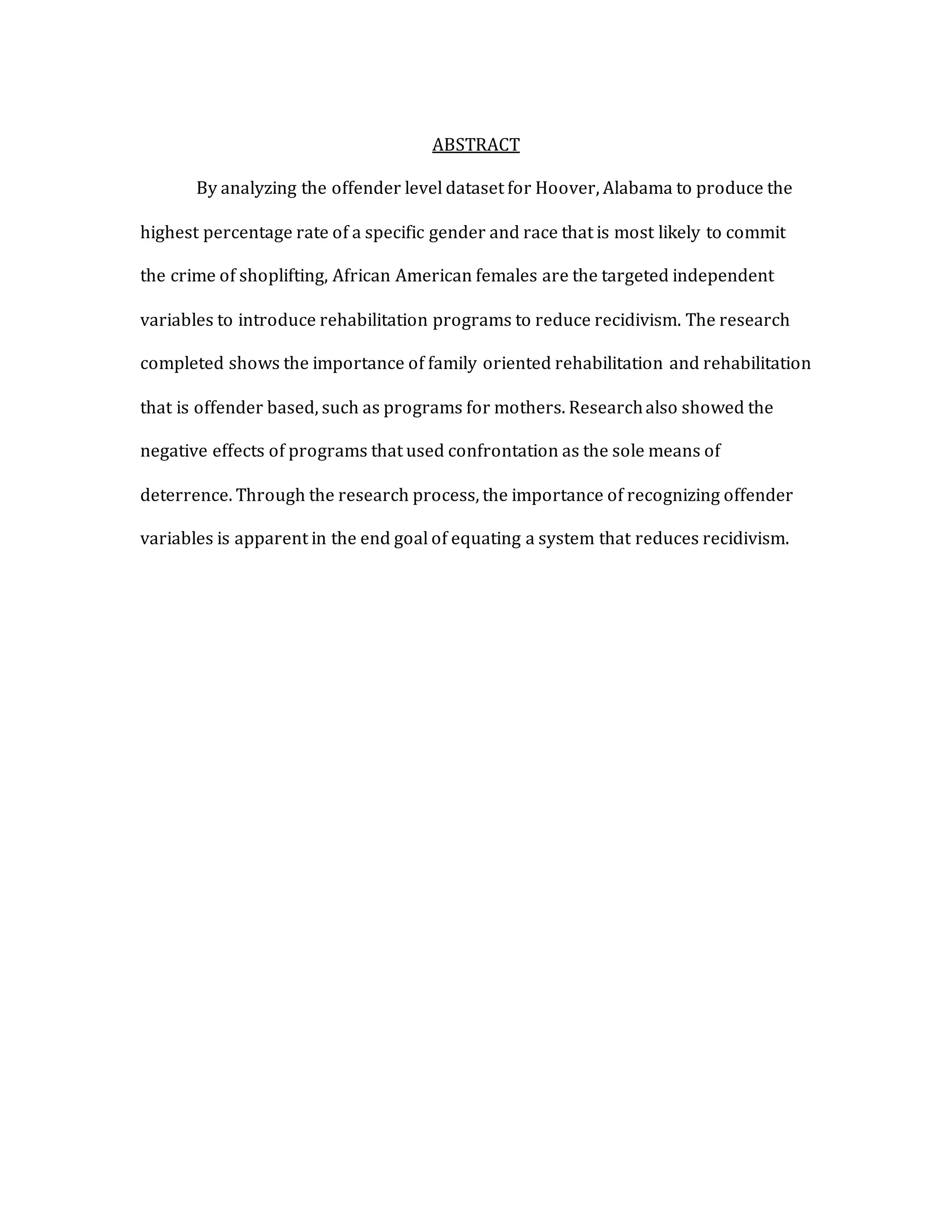 This document discusses a study analyzing shoplifting crime data from Hoover, Alabama. The study found that African American females had the highest rate of shoplifting crimes reported. The purpose is to use this data to develop targeted rehabilitation programs aimed at reducing recidivism. Some proposed programs include education and job skills programs, as well as programs focused on family relationships and the impact on children. Confrontational deterrence programs are found to be ineffective, while rehabilitation programs tailored to individual offenders show more positive results in reducing repeat offenses.