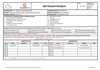 This document provides a job hazard analysis for the foundation work of the De-Ethanizer section, which includes various tasks like excavation, formwork assembly, concrete pouring, and surveying. It identifies hazards associated with each task such as slips/trips/falls, pinch points, equipment strikes, and exposures to chemicals, dust, and noise. Control measures are outlined like using proper PPE, barricades, spotters, and ensuring equipment is in good working order. Emergency procedures are also described for injuries or gas releases.