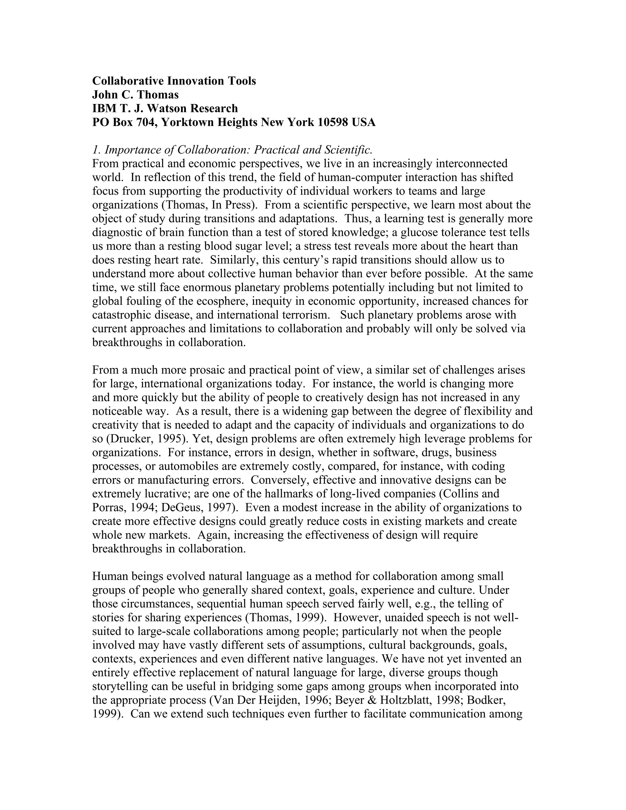 This document discusses the importance of collaboration and some challenges to effective collaboration. It notes that while natural language evolved for small groups, new tools are needed for large, diverse collaborations. Specifically, it argues that expressive communication like storytelling can help build trust and shared understanding between collaborators. The document also suggests that perceptual experiences could be enhanced to make systemic problems more salient and motivate collaborative thinking and knowledge sharing.