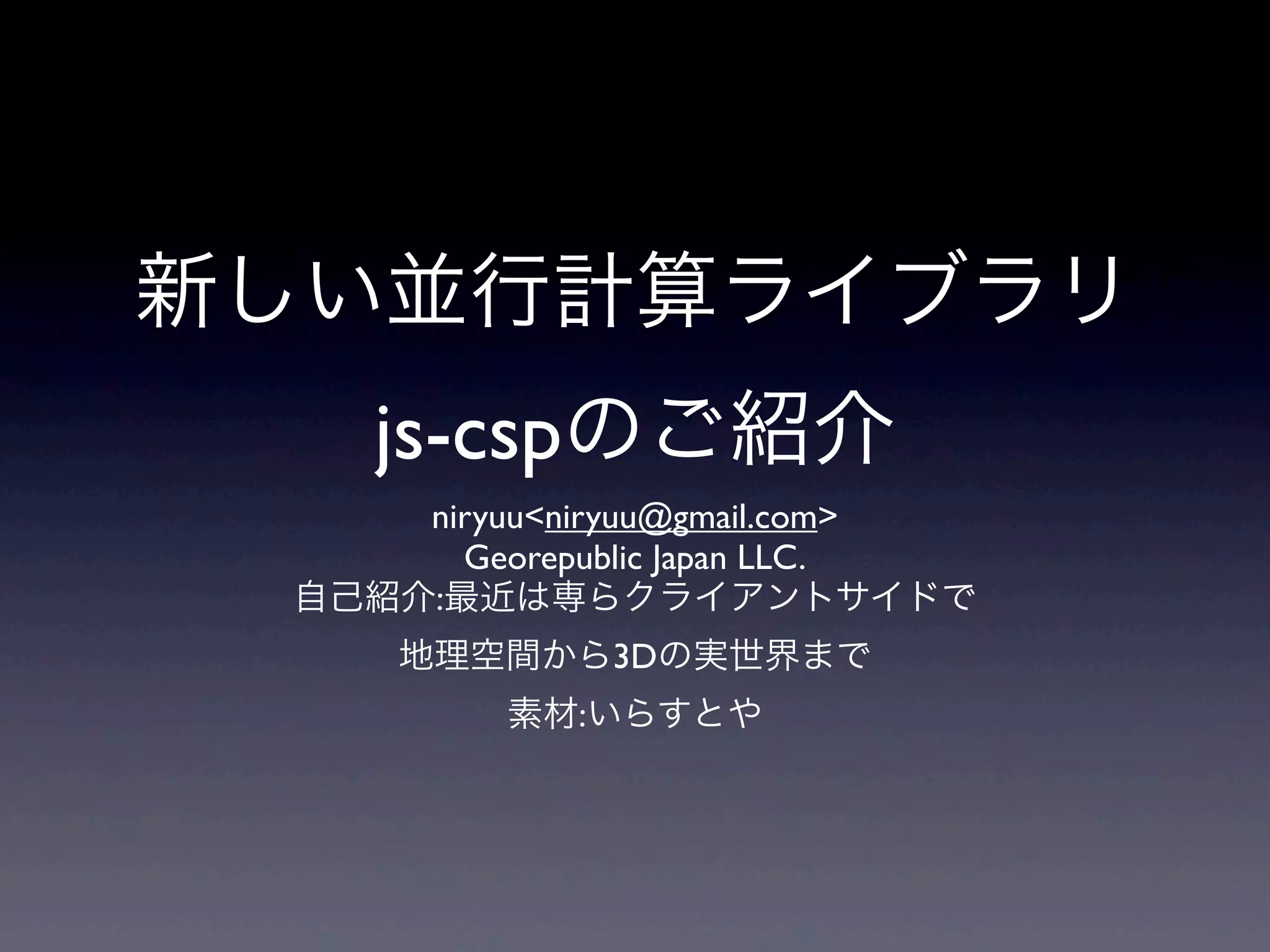 新しい並行計算ライブラリ js-cspのご紹介 niryuu<niryuu@gmail.com> Georepublic Japan LLC. 自己紹介:最近は専らクライアントサイドで 地理空間から3Dの実世界まで 素材:いらすとや