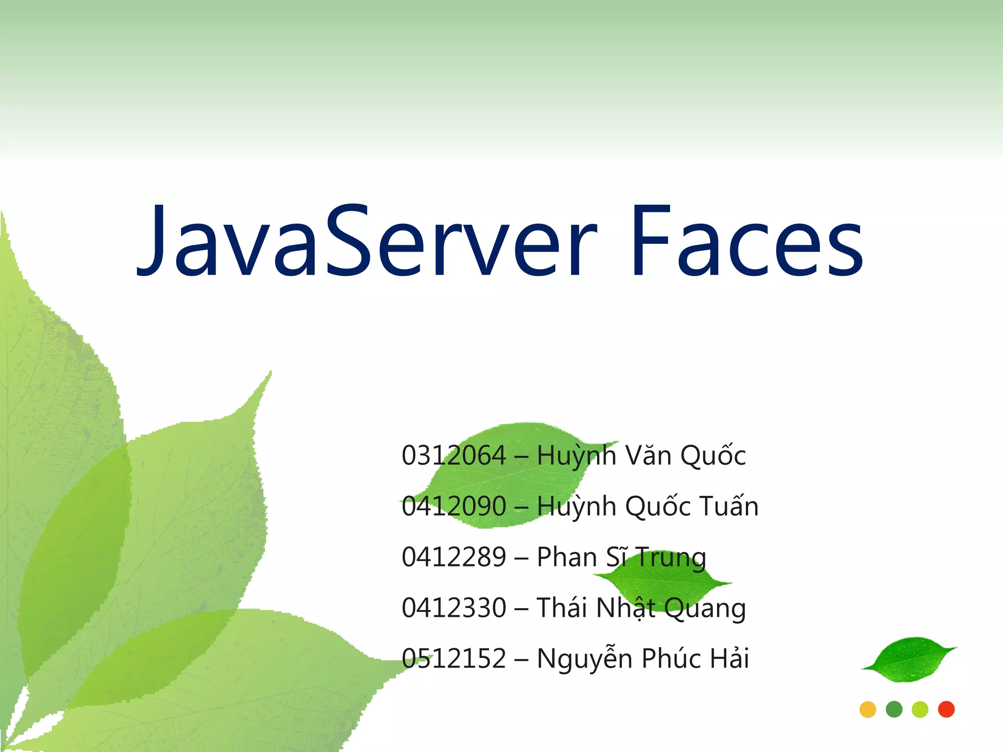 Tài liệu trình bày về JavaServer Faces (JSF), bao gồm kiến trúc, các thành phần và ưu nhược điểm của nó trong phát triển web. JSF là một framework giúp đơn giản hóa việc phát triển giao diện người dùng dựa trên mô hình MVC, hỗ trợ các thành phần GUI và kiểm tra dữ liệu. Tài liệu cũng so sánh JSF với các công nghệ khác như Struts, nhấn mạnh các lợi ích và nhược điểm của JSF.