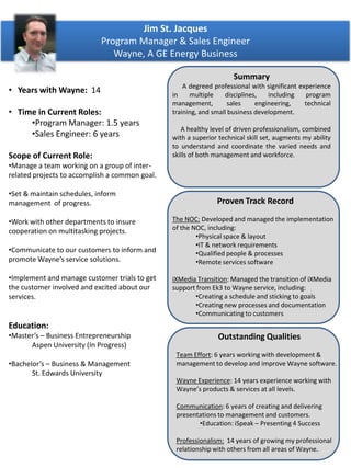 Jim St. Jacques is a program manager and sales engineer at Wayne, A GE Energy Business with over 14 years of experience. He manages a team working on interrelated projects to accomplish common goals, sets and maintains schedules, and ensures cooperation across departments. He also communicates with customers to promote Wayne's service solutions and implements customer trials. Previously, he has managed the development of a network operations center and the transition of support for a product from one company to Wayne.