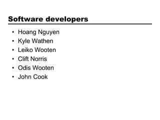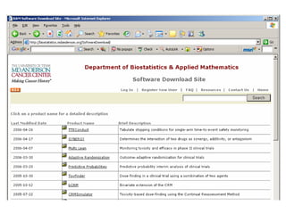 This document discusses Bayesian clinical trial software developed by John D. Cook and colleagues at M. D. Anderson Cancer Center. It describes software tools for designing trials, such as for sample size calculation and dose finding, and for conducting trials, such as for safety monitoring and adaptive randomization. Challenges in clinical trial conduct software design are also outlined, such as handling changes during a trial. Resources for downloading or learning more about the software are provided.