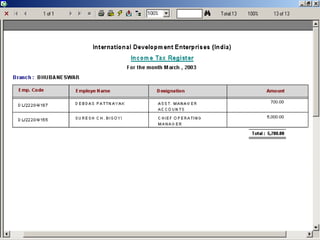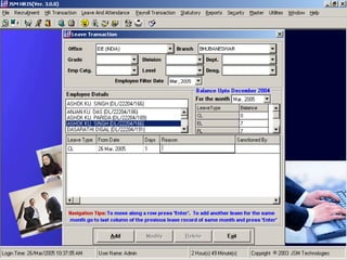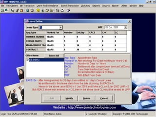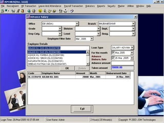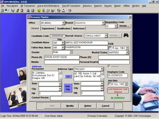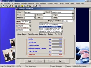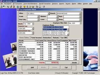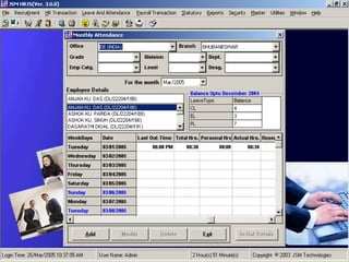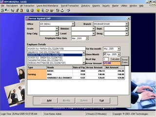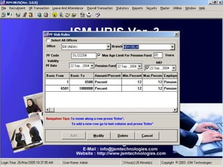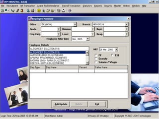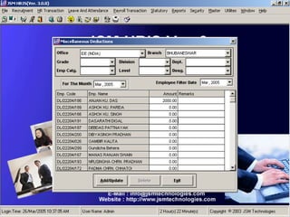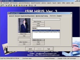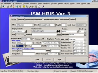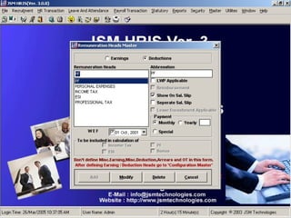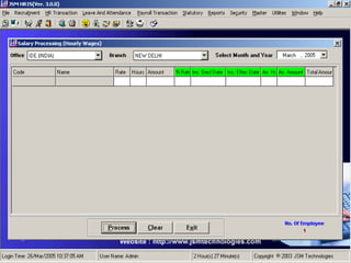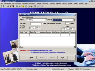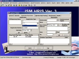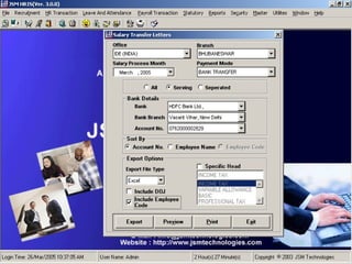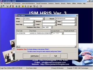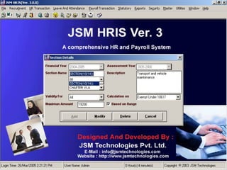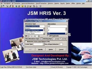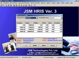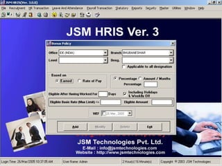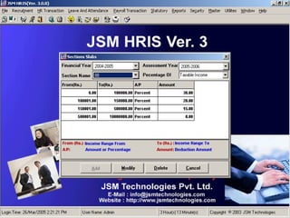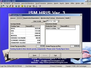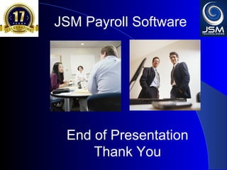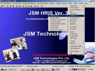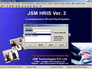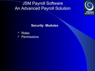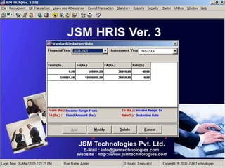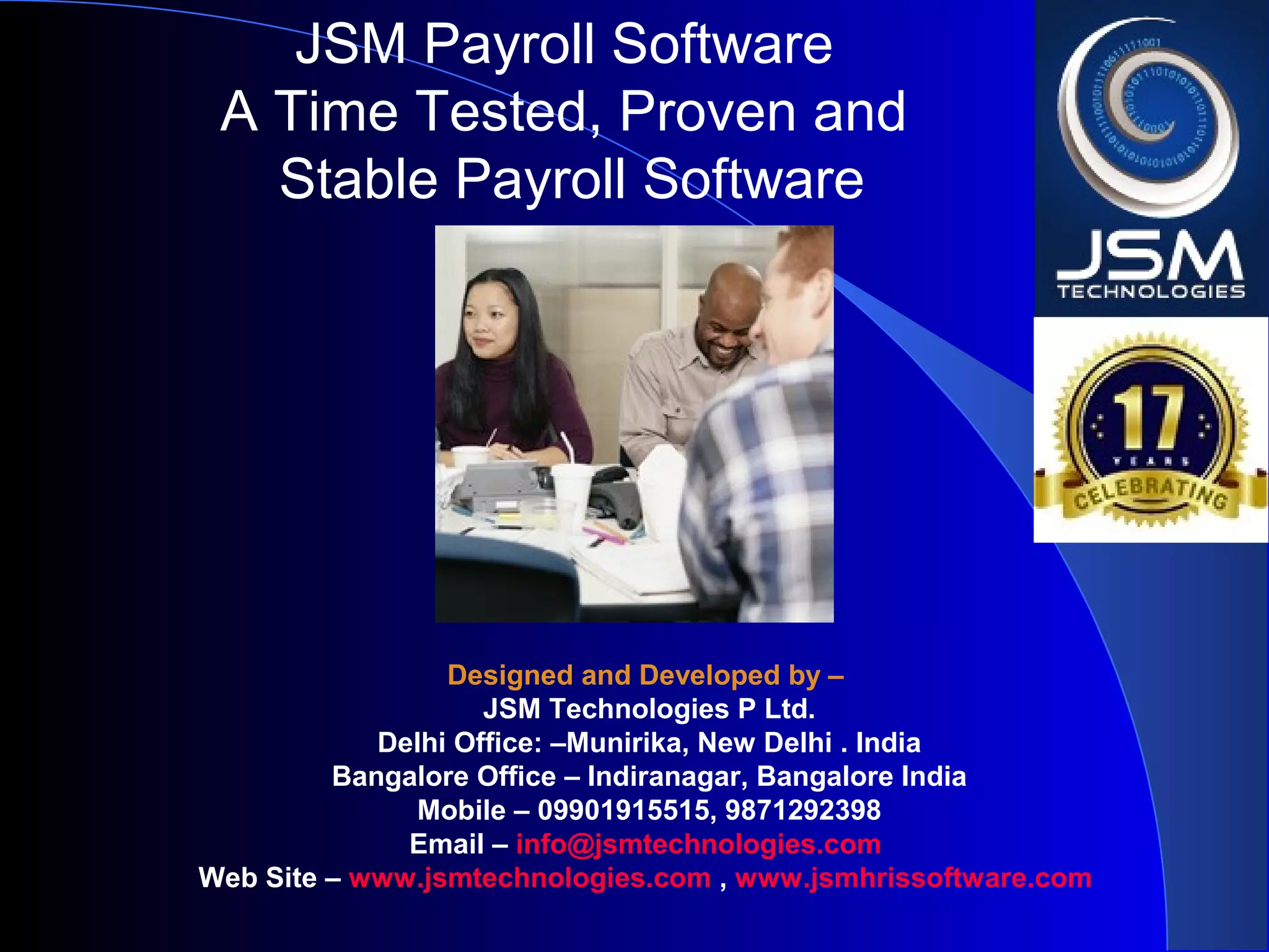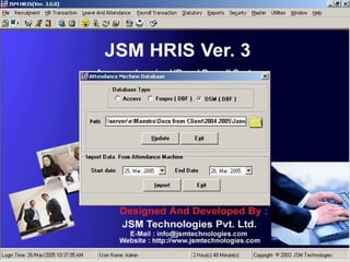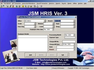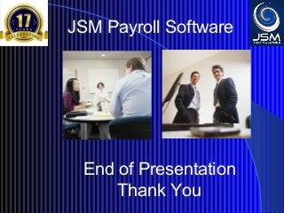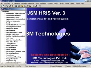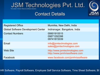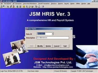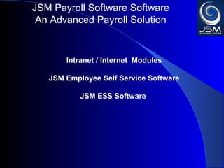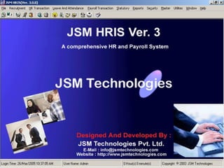 JSM Payroll is a comprehensive payroll software developed by JSM Technologies, established in May 2000, offering advanced solutions for HR processes with over 14 years of research and expert input. The software is fully customizable, integrates with employee self-service modules, and supports various payroll functions including statutory compliance, attendance tracking, and reporting. JSM Technologies aims to provide operational excellence and superior customer satisfaction while facilitating effective HR automation and employee management.