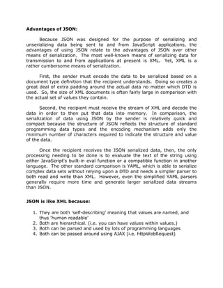 JSON (JavaScript Object Notation) is a lightweight, language-independent data-interchange format that is easy to read and write. It offers advantages over XML, such as being more compact and quicker to parse, while allowing for complex data structures through key-value pairs and arrays. Despite its ease of use, JSON can be challenging for beginners due to its strict syntax and lack of universal naming conventions.