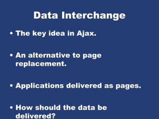 The document provides an extensive overview of JSON (JavaScript Object Notation), its characteristics, structure, and history, emphasizing its utility in data interchange, particularly in AJAX applications. It contrasts JSON with XML, outlining advantages such as being lightweight, language-independent, and easy to parse, while also addressing its limitations like the lack of namespacing and extensibility. Additionally, the document discusses the evolution of JSON within the context of web technologies and security considerations for mashups.