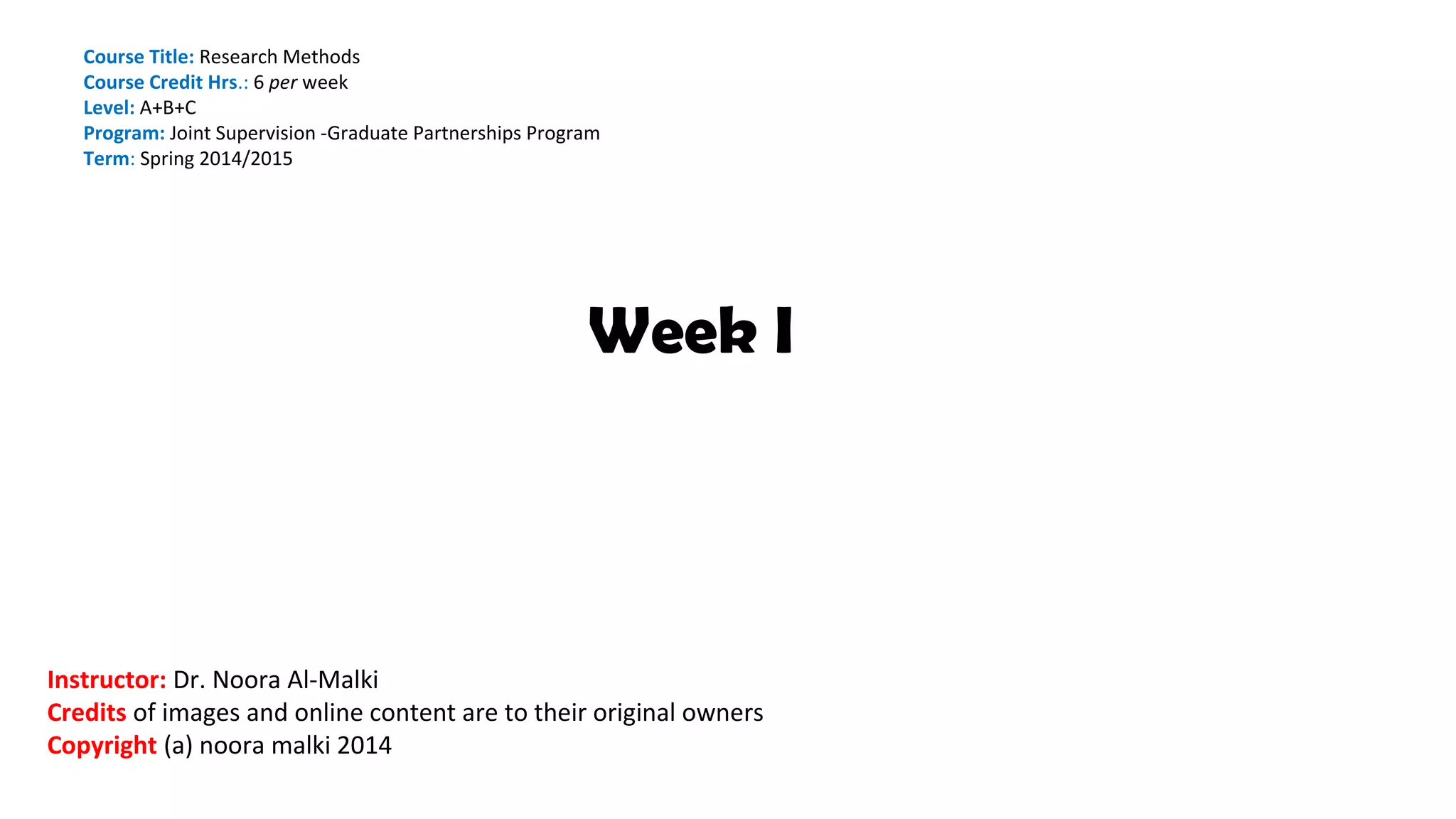 This document outlines the course content for the first week of a 6-credit research methods course taught by Dr. Noora Al-Malki in spring 2014/2015. The week will introduce students to key research concepts like defining research, the research process, and topic selection. Students will learn about the advantages of research, a researcher's responsibilities, and essential research skills. They will also complete assignments introducing themselves and brainstorming potential research topics. Readings assigned for the first week cover research basics, writing a research paper, and developing a research topic. The next class will focus on research paper components, organization, resources, ethics, and documentation styles.