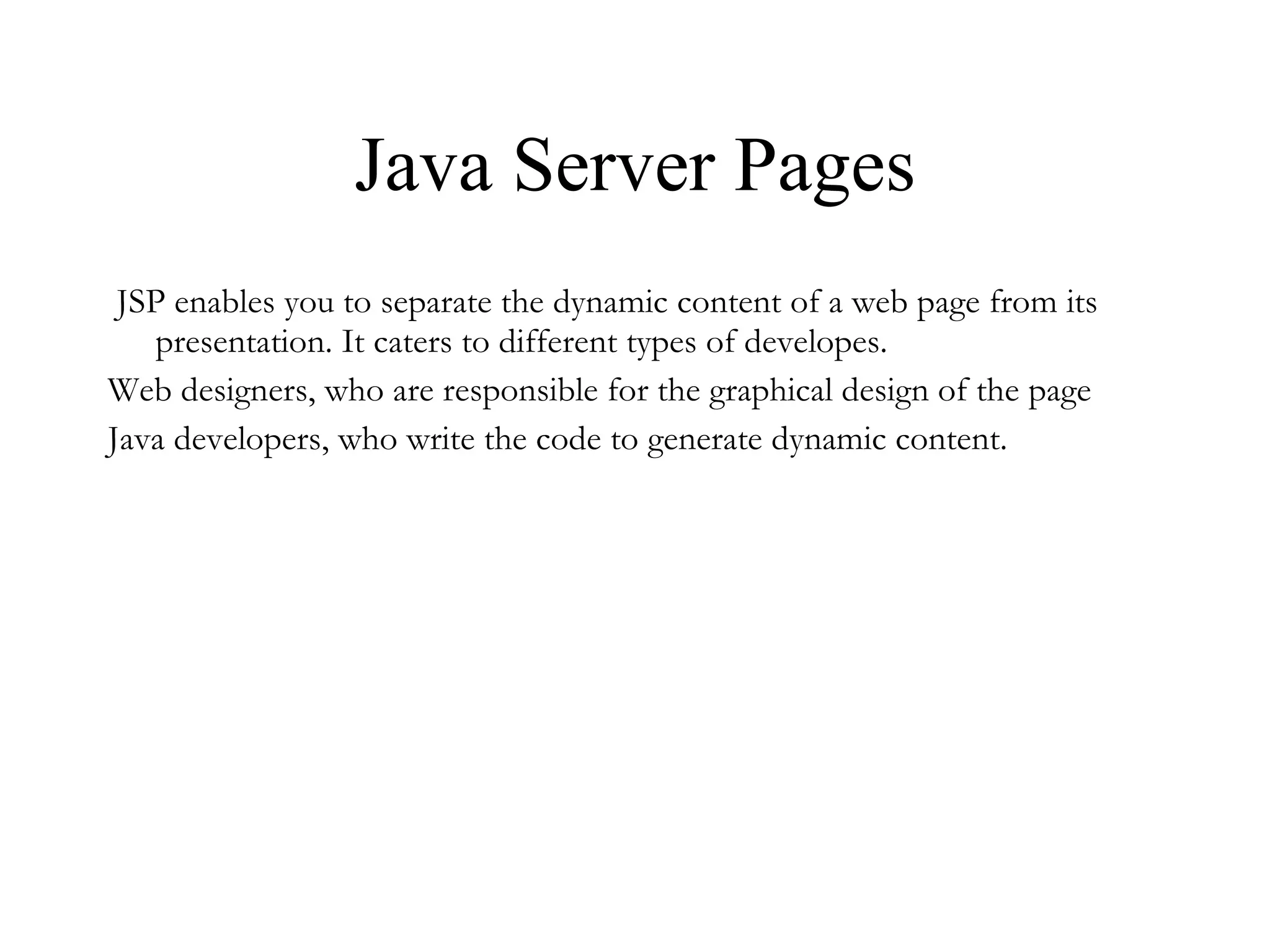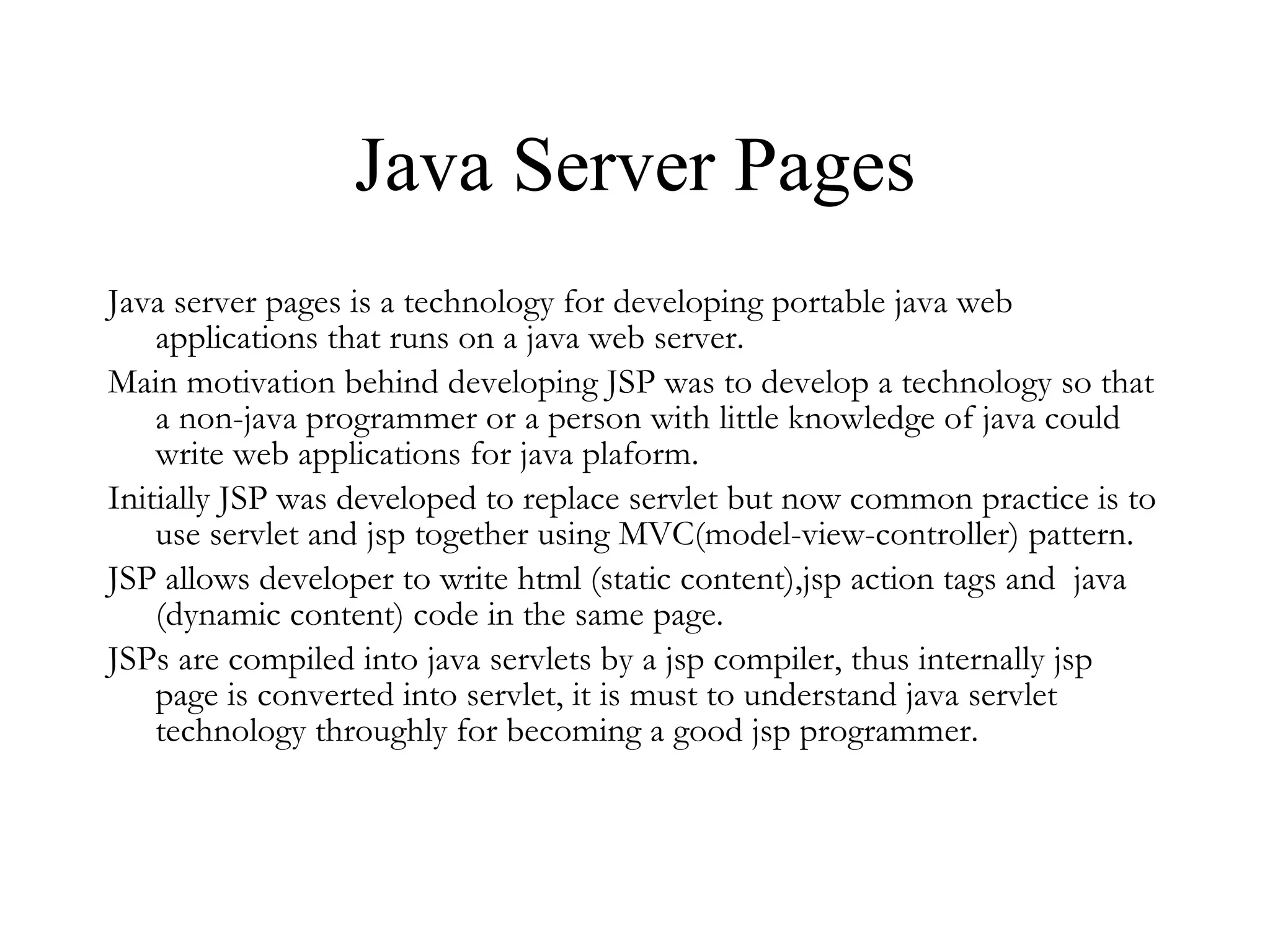 Java Server Pages (JSP) is a technology that allows developers to create dynamic web applications using Java code embedded in HTML pages. JSP pages are compiled into Java servlets, allowing dynamic content to be generated. JSP supports the use of scripting elements like expressions, scriptlets, and declarations directly in HTML pages to add dynamic functionality. Common elements like directives, actions, and standard tags provide functionality like including pages, passing parameters, and abstracting common patterns.