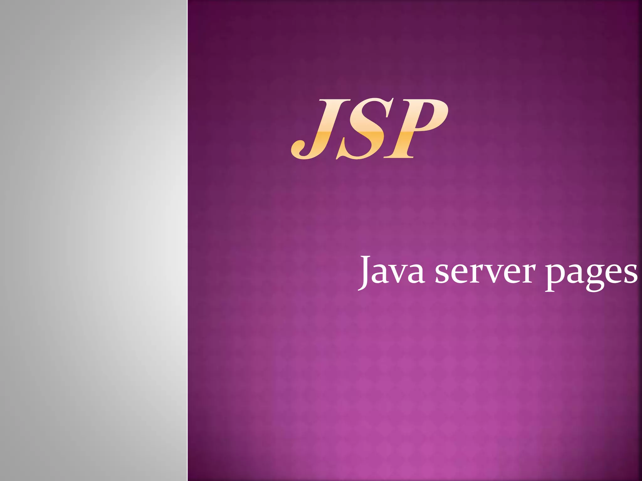 Java Server Pages (JSP) is a technology that allows developers to embed Java code in HTML pages to create dynamic web content. JSP pages are compiled into servlets, so they can benefit from the full functionality of the Java programming language. The JSP lifecycle involves compilation, initialization, execution, and cleanup similar to a servlet lifecycle. Key tags like scriptlets allow inserting Java code directly into JSP pages to generate dynamic output.