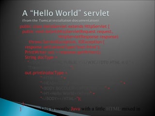 - JSP files are translated into Java servlets behind the scenes, with the Java code enclosed in tags executed on the server and HTML returned to the client. This allows generating HTML dynamically based on Java logic and data.