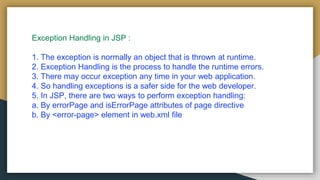 The document discusses exception handling in JSP, highlighting the importance of managing runtime errors and the two primary methods for handling exceptions: using error-page directives or the web.xml file. It also covers JSP action tags that control page flow and resource inclusion, detailing their functions and advantages, particularly in promoting code reusability. Additionally, it introduces JavaBeans, emphasizing their properties, advantages, and disadvantages in Java applications.