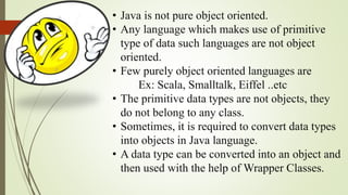Java is not purely object-oriented as it uses primitive data types like int and double that are not objects. Wrapper classes like Integer and Double allow primitive types to be used as objects. Wrapper classes wrap a primitive type and provide object-oriented functionality like methods. Wrapper classes are used when primitive types need to be added to collections or converted between primitive and object types.
