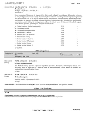 This document is Ashley Markowski's unofficial military transcript. It shows that she completed Basic Combat Training in 2015 and a Practical Nurse course in 2016. The transcript lists the courses she completed, including subjects like anatomy, pharmacology, and nursing fundamentals. It also provides information on her military occupation as a Practical Nursing Specialist from 2016 to the present.