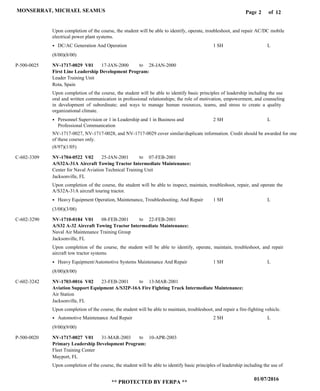 Michael Monserrat's transcript shows that he has completed extensive military training courses related to aviation support equipment maintenance and instruction. These include courses in mobile electric power plants, aircraft towing tractors, firefighting trucks, leadership, hydraulics, diesel engines, and instructional methodology. His military experience includes roles as a seaman, personnelman, mobile electric power plants technician, aviation support equipment technician, instructor, and master training specialist.