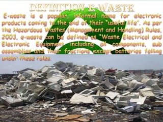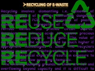 2) Reuse involves slight modification of still-functioning electronics like computers and refilling inkjet cartridges to reduce waste generation.