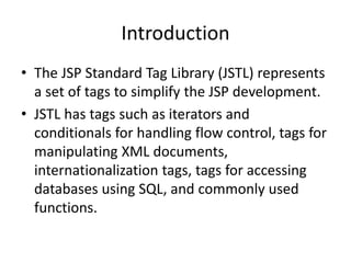 The document provides information about the JSTL (JSP Standard Tag Library). It discusses how JSTL aims to address some of the shortcomings of using scriptlets in JSPs by providing XML tags that can perform common tasks like iteration and flow control. It describes some of the core JSTL tags like <c:forEach>, <c:if>, and <x:out> and how they can be used as alternatives to scriptlets. It also lists some advantages of using JSTL such as improved code reusability, readability and maintainability compared to embedding Java code in JSPs.