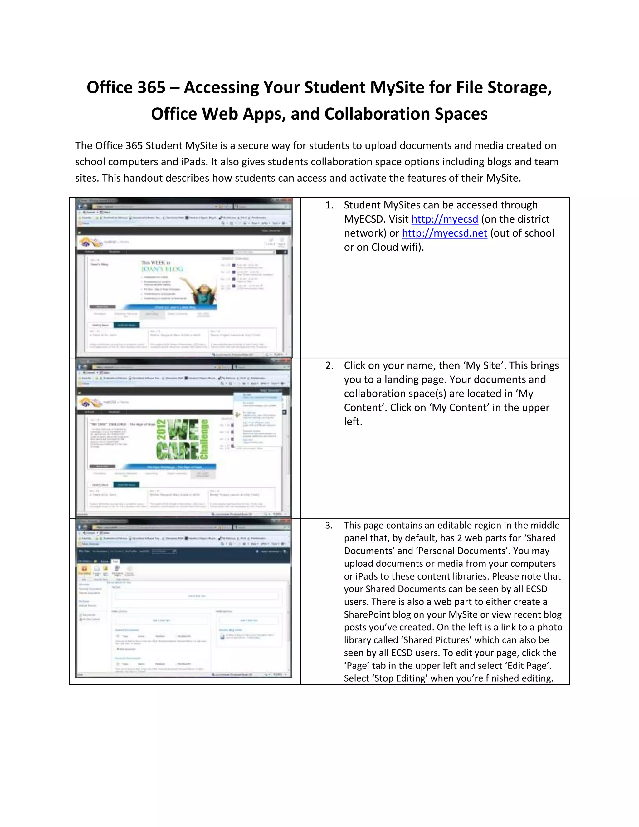 This document describes how students can access and use the key features of their Office 365 Student MySite for file storage, collaboration, and using Office Web Apps. Key features include uploading documents to personal or shared libraries, creating blogs and team sites for collaboration, and using Office Web Apps to create and edit documents without having a full Office installation.