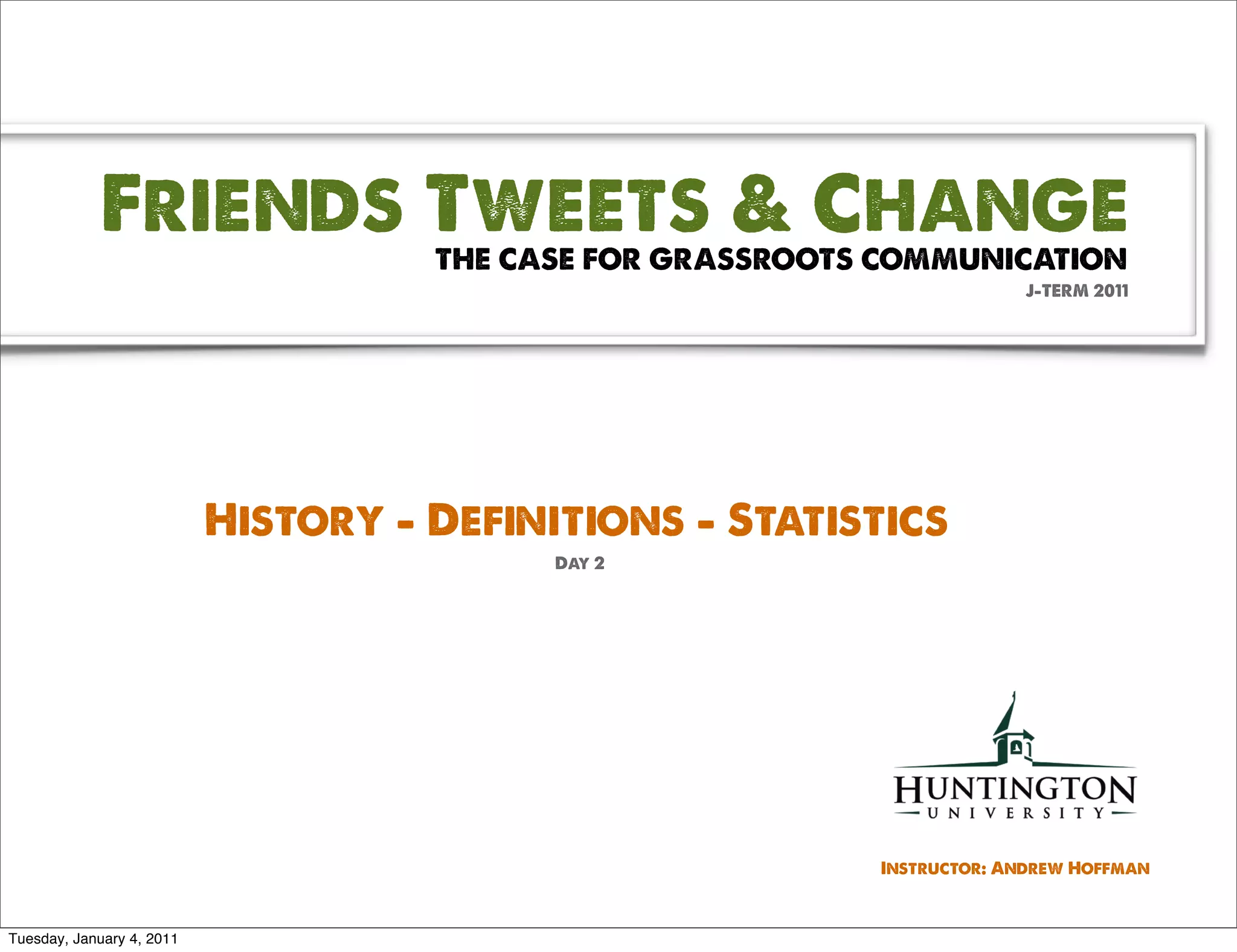The document outlines a class focused on grassroots marketing techniques and the influence of social media, detailing definitions, historical context, and statistics related to Web 1.0 and Web 2.0. It discusses the uniqueness of social network sites in facilitating connections among users, emphasizing shared offline ties. Additionally, it provides various examples of social media platforms and their respective user statistics.