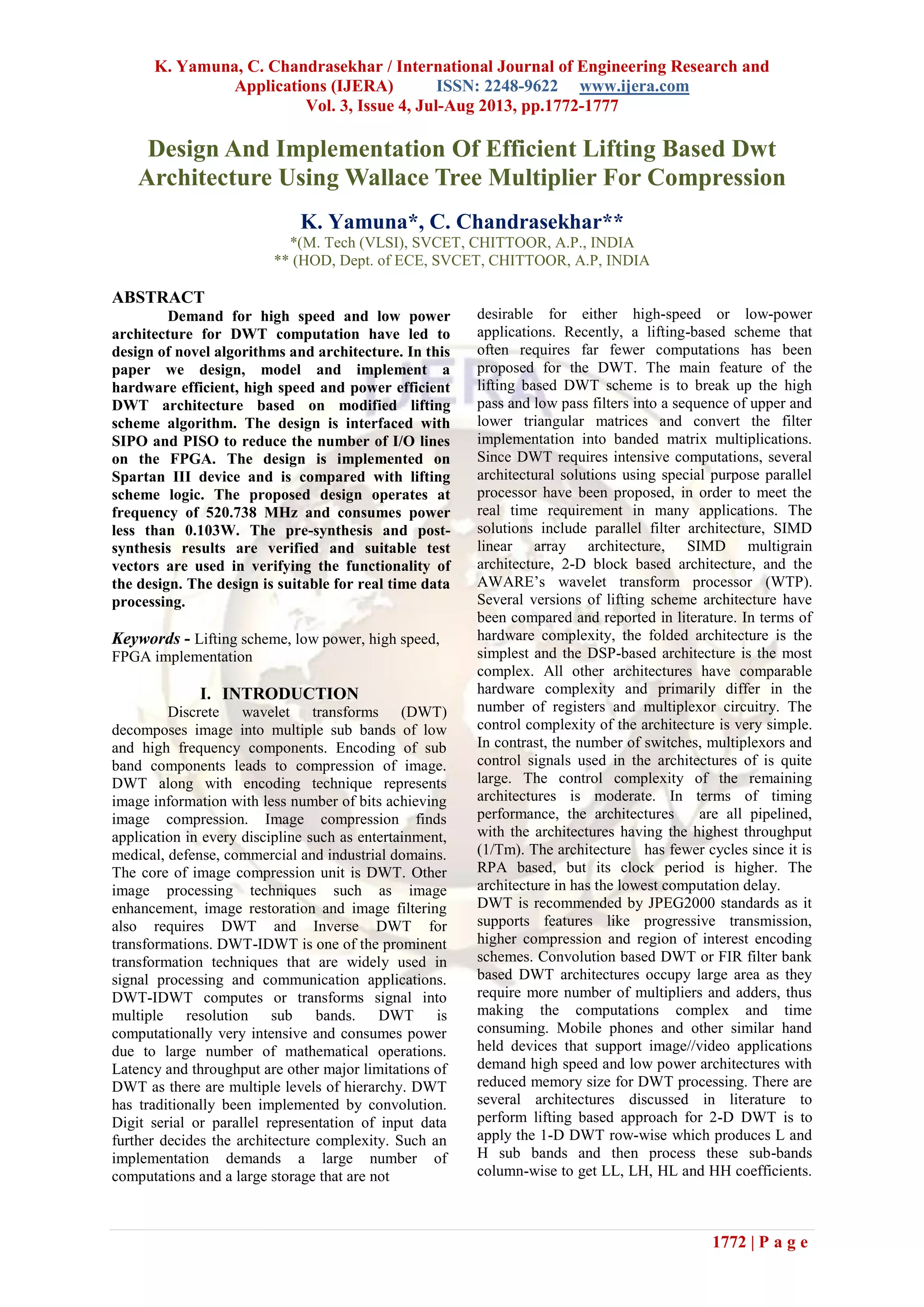This paper presents a hardware-efficient discrete wavelet transform (DWT) architecture using a modified lifting scheme and Wallace tree multiplier for low power and high-speed operations, implemented on an FPGA device. The design achieved operational frequencies of 520.738 MHz with power consumption below 0.103W, making it suitable for real-time data processing applications. Various architectural solutions for DWT are compared, highlighting the proposed architecture's advantages in performance and reduced computational complexity.
