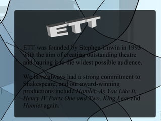 ETT was founded in 1993 by Stephen Unwin with the goal of creating outstanding theatre and touring productions to wide audiences. They have had success producing Shakespearean plays like Hamlet, As You Like It, Henry IV Parts One and Two, and King Lear. While ETT generates income from ticket sales and commercializing their work, they rely on support from individuals, trusts, and foundations to fund their core work and future plans, which include more touring, reaching wider audiences, and opportunities for young people.