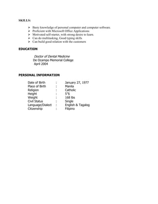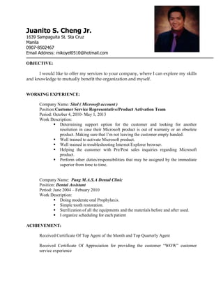 Juanito S. Cheng Jr. is seeking a position that allows him to utilize his skills and knowledge. He has over 10 years of experience in customer service roles, most recently as a Customer Service Representative for Microsoft where he helped customers with product activation and troubleshooting. Prior to that, he worked as a Dental Assistant for 6 years providing oral care services and ensuring sterilization of equipment. He has received awards for his customer service and has skills in Microsoft Office, multitasking, communication, and computer troubleshooting. He holds a Doctor of Dental Medicine degree from De Ocampo Memorial College.