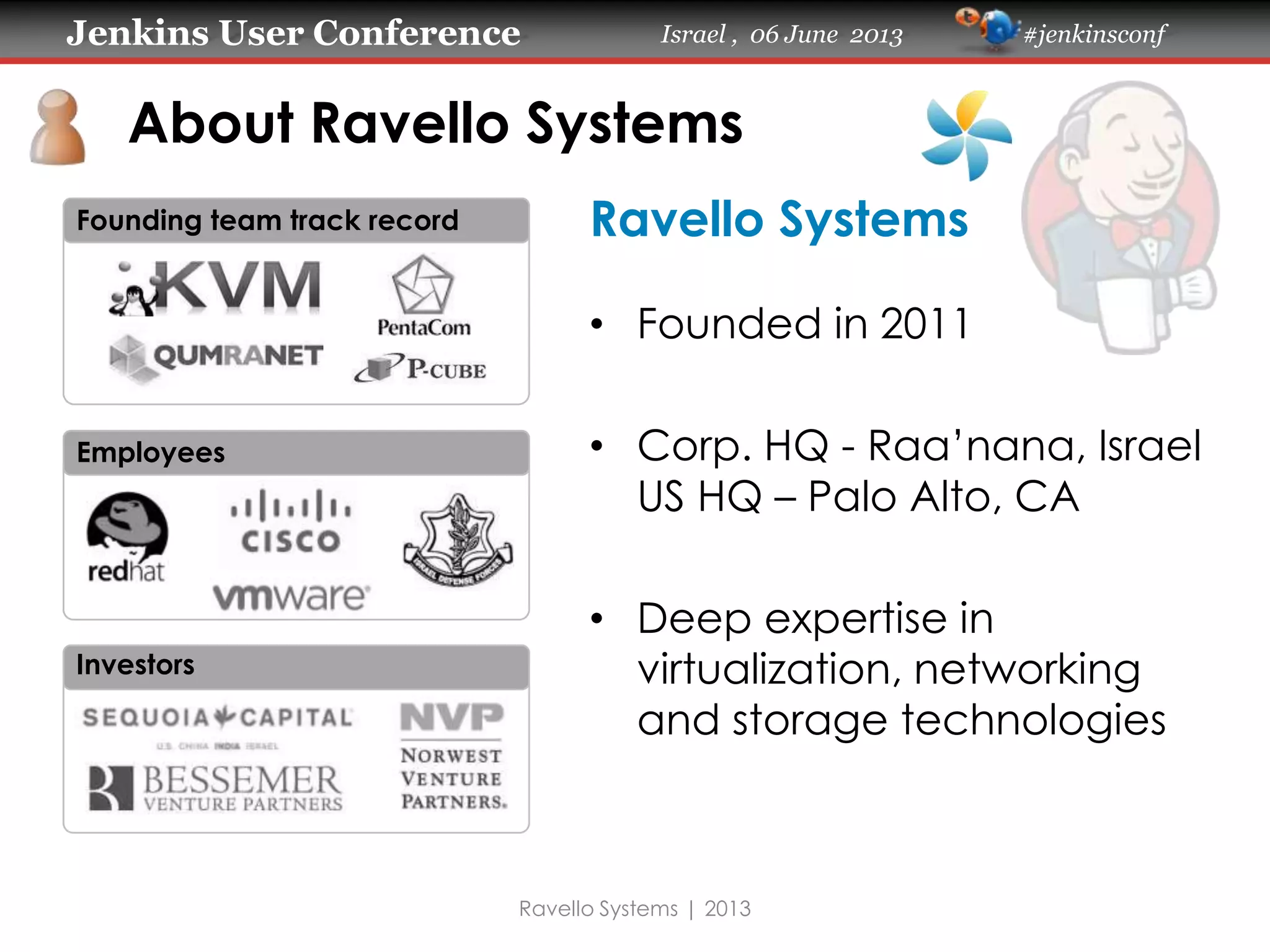 The document discusses using Jenkins and Ravello Systems to supercharge test and development processes with the cloud. Ravello Systems provides a "cloud application hypervisor" that allows defining and running entire applications across clouds for testing. The presentation advocates automating testing by provisioning identical replicas of production with each commit using Ravello and Jenkins workflows to parallelize tests and shorten run times. It demonstrates how to leverage feature toggles and runtime configuration through Jenkins, Maven, and Ravello.
