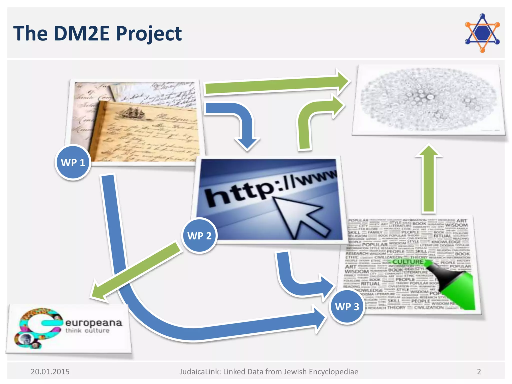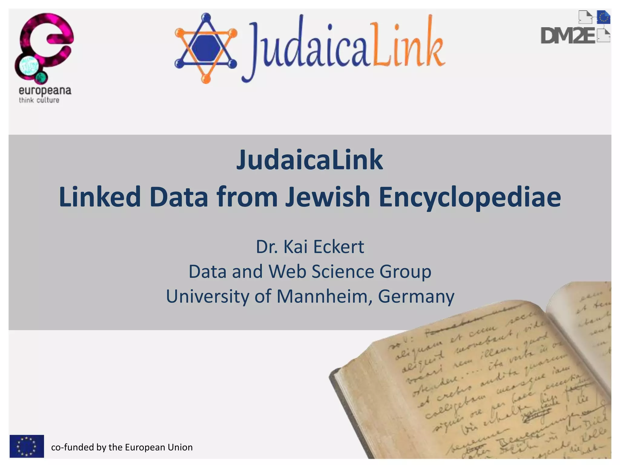 The document outlines the Judaicalink project, co-funded by the European Union, aimed at creating linked data from Jewish encyclopedias. It details the project's structure, data acquisition methods, and potential applications for enhancing authority data, including collaboration with partner organizations. Future plans involve seeking funding and expanding the data linking with scholarly and other encyclopedia content.
