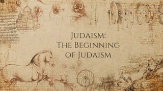 Judaism began as the religion of the ancient Hebrews around 1800 BCE, originating from the call of Abraham and codified in the Torah and the covenant with God through Moses. The core texts of Judaism are the Torah, Nevi'im, and Ketuvim which make up the Tanakh, and the religion's major divisions are Orthodox, Conservative, and Reform Judaism which have differing views on traditions and modernization. The document provides historical context on the origins and development of Judaism from Abraham to the present day.