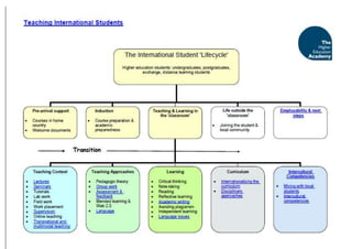 The Teaching International Students project aims to help higher education institutions effectively support international students through cultural awareness and inclusive teaching practices. It provides resources on understanding different academic cultures, developing student skills, encouraging participation, creating globally-relevant curricula, and anticipating typical problems experienced by international students. The project emphasizes adopting a program-level approach and making academic expectations and assumptions transparent to students.