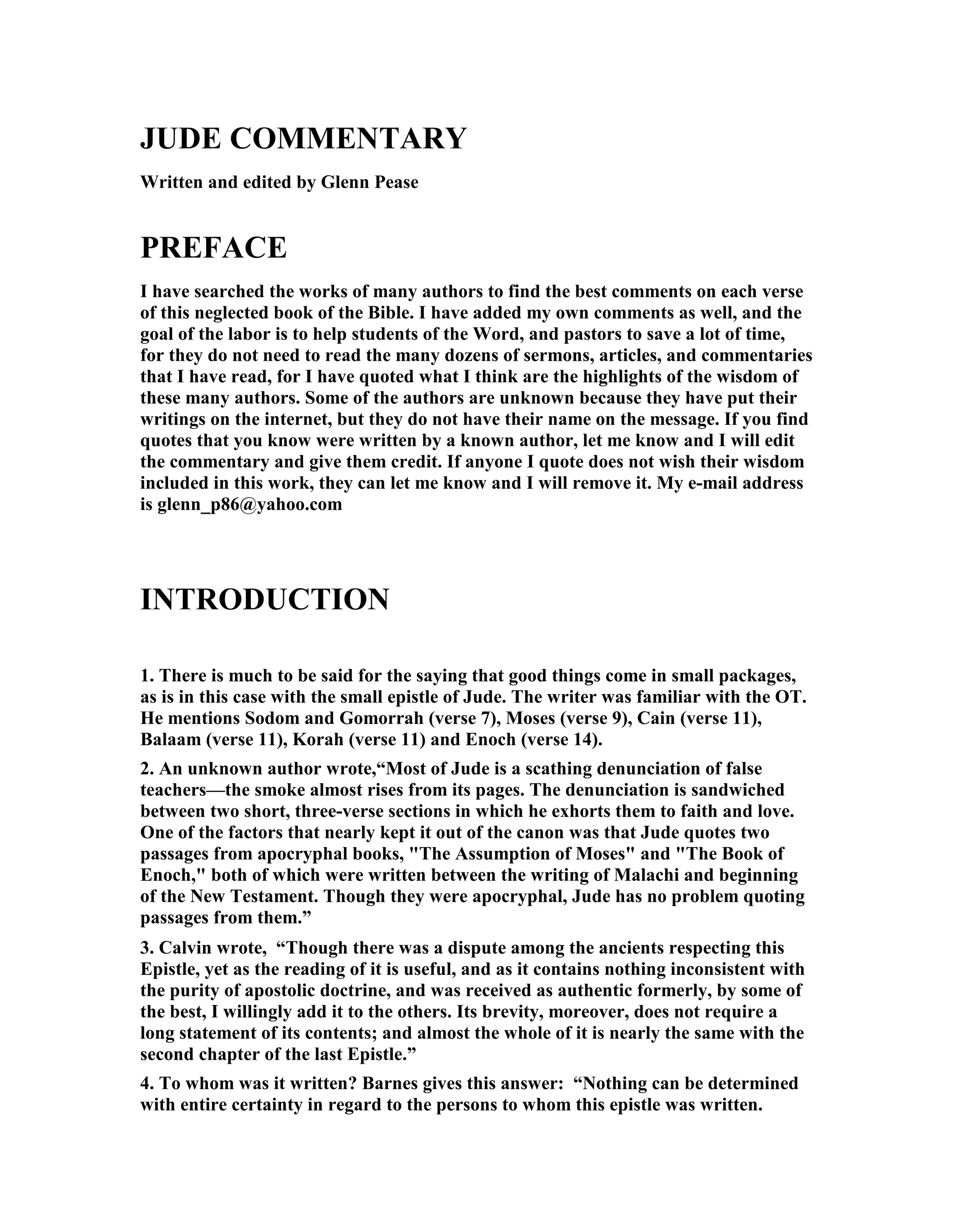 The document is a detailed commentary on the biblical epistle of Jude, exploring its authorship, themes, and warnings against false teachings. It emphasizes the importance of discerning spiritual leaders and understanding the dangers of apostasy within Christianity. The author, Glenn Pease, aims to compile valuable insights from various scholars to aid students and pastors in their study of Jude.