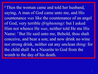 Manoah's wife told him that an angel had appeared to her and said she would give birth to a son who would be a Nazarite dedicated to God. Manoah prayed that the angel would return to instruct them further. When the angel returned, Manoah asked how they should raise the child. The angel reiterated that the son must not eat or drink anything from the vine and must follow the requirements of a Nazarite. Manoah realized the angel had already given the instructions to his wife.