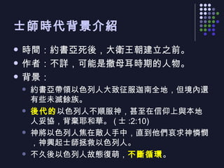 士師記描述了以色列人在約書亞死後至大衛王朝建立前的悖逆歷史。以色列人因不順服神而遭受敵人侵擾,在痛苦中哀求神,從而興起士師拯救他們,形成了多次歷史循環。此時期以色列缺乏統一的領導,各人隨意行事,造成社會混亂。