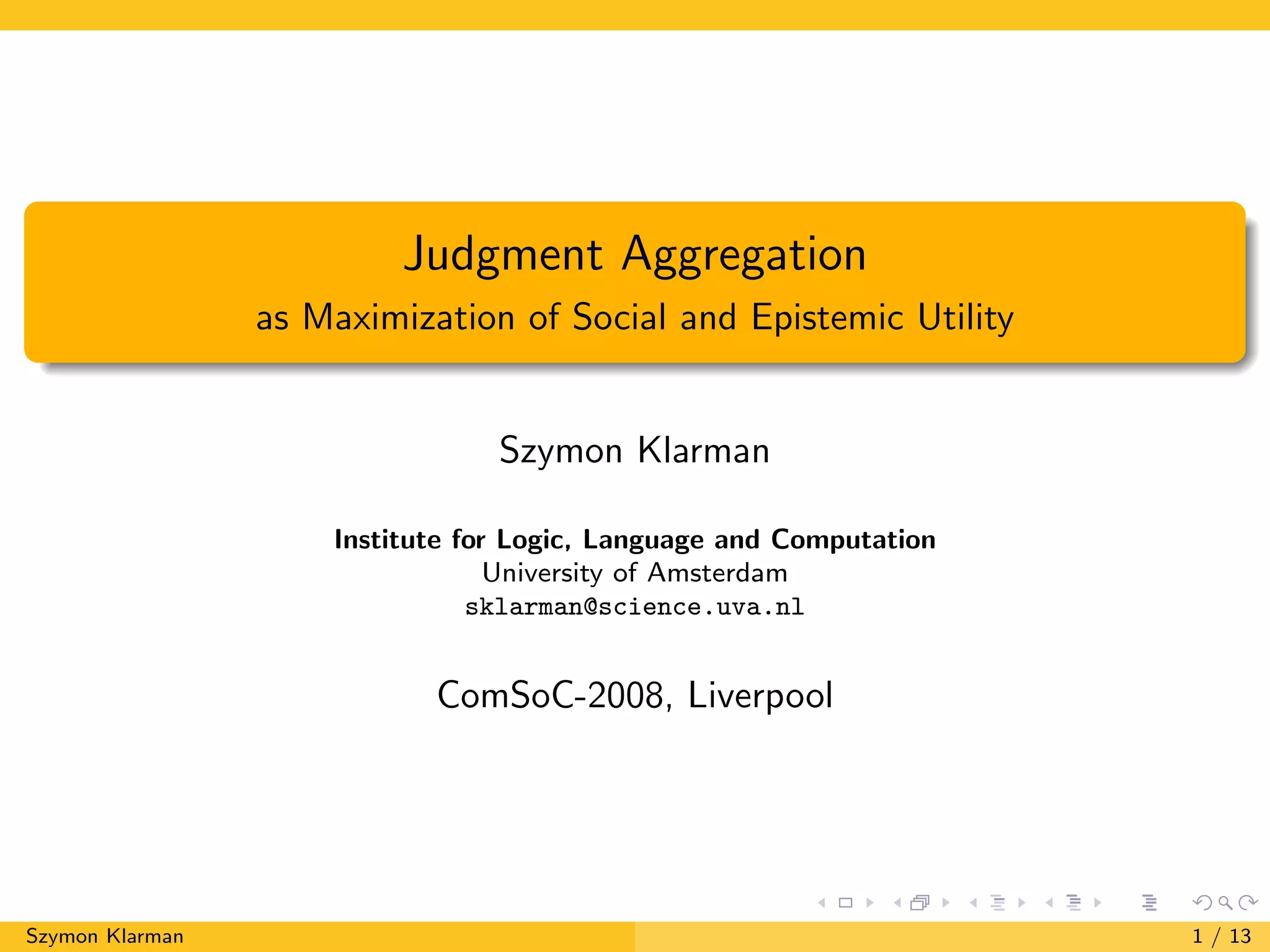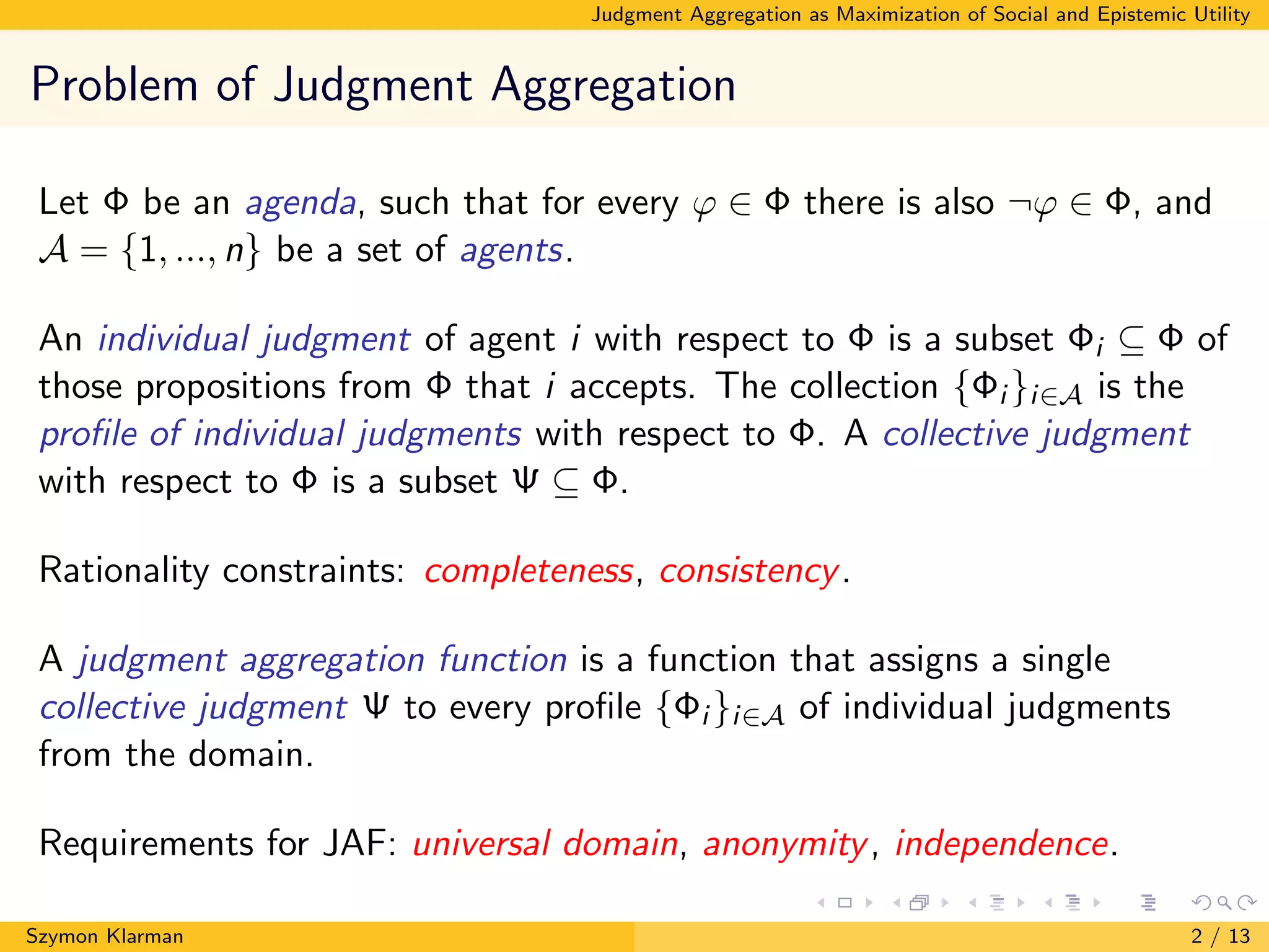 The document discusses judgment aggregation as the maximization of social and epistemic utility, exploring the challenges of collective decision-making. It highlights the impossibility of the propositionwise majority voting rule and offers solutions by relaxing rationality constraints. The paper proposes a utilitarian model that reconciles social choice theory with epistemology, although its practical application remains debatable.