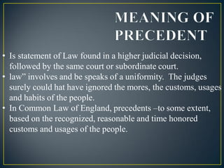 Judicial precedent refers to legal principles established by higher court decisions, which must be followed by lower courts, promoting uniformity in law. It includes different types of precedents such as declaratory, persuasive, authoritative, and conditionally authoritative, each with specific binding characteristics. The Supreme Court of India is the highest authority, binding all other courts, and its decisions encompass both the ratio decidendi and obiter dicta, with a principle of stare decisis guiding their application.