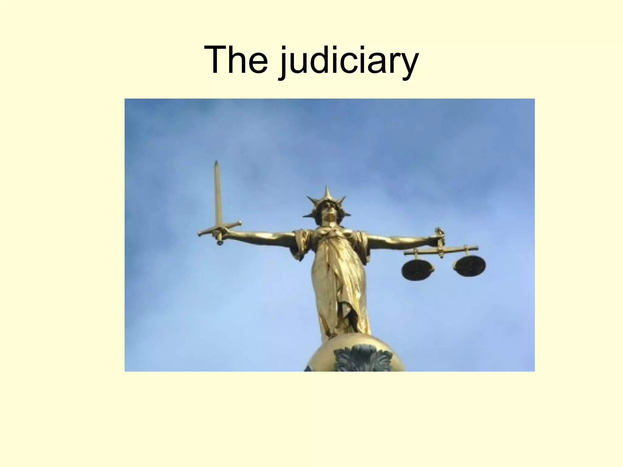The judiciary plays several key political roles in the UK system of government. It acts to dispense justice fairly, interpret the laws as intended by Parliament, and establish legal precedents through case law. However, judges' ability to check the executive has come under increasing criticism from politicians, as judges have challenged government policies on issues like civil liberties, counter-terrorism laws, and sentencing guidelines. To increase the independence and impartiality of the judiciary, major reforms were passed in 2005 that replaced the Lord Chancellor and established new judicial appointment processes.