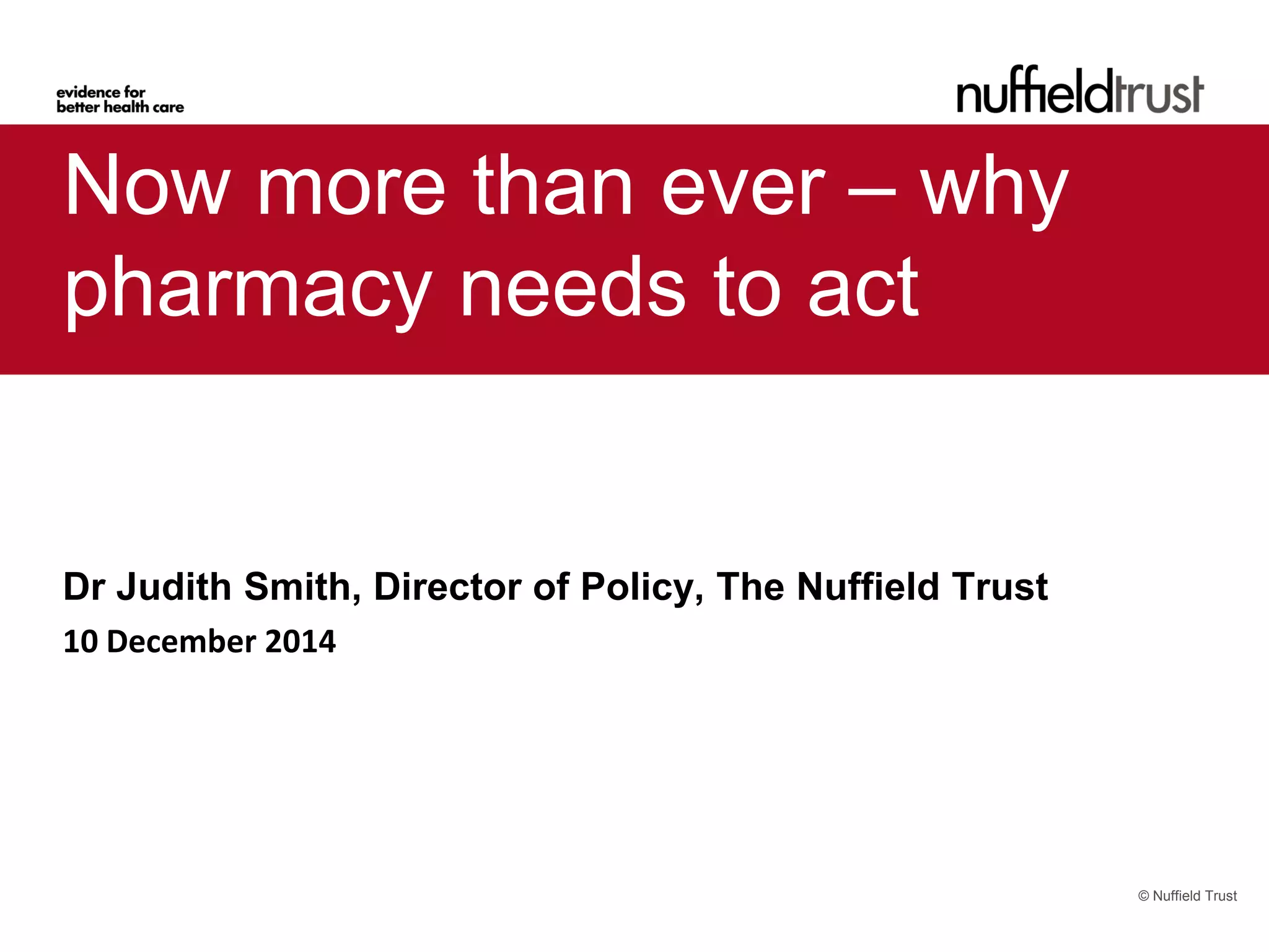 The Nuffield Trust's one-year review evaluates the progress made by the Royal Pharmaceutical Society (RPS) since the 2013 report 'Now or Never', which envisioned a more engaged role for pharmacists in healthcare. The review highlights that while initial enthusiasm for pharmacy's expanded role has diminished, significant strides have been made in areas like urgent care and public health. It emphasizes the necessity for unified messaging, practical backing from national policies, and local advocacy to sustain momentum and opportunities for the pharmacy profession.