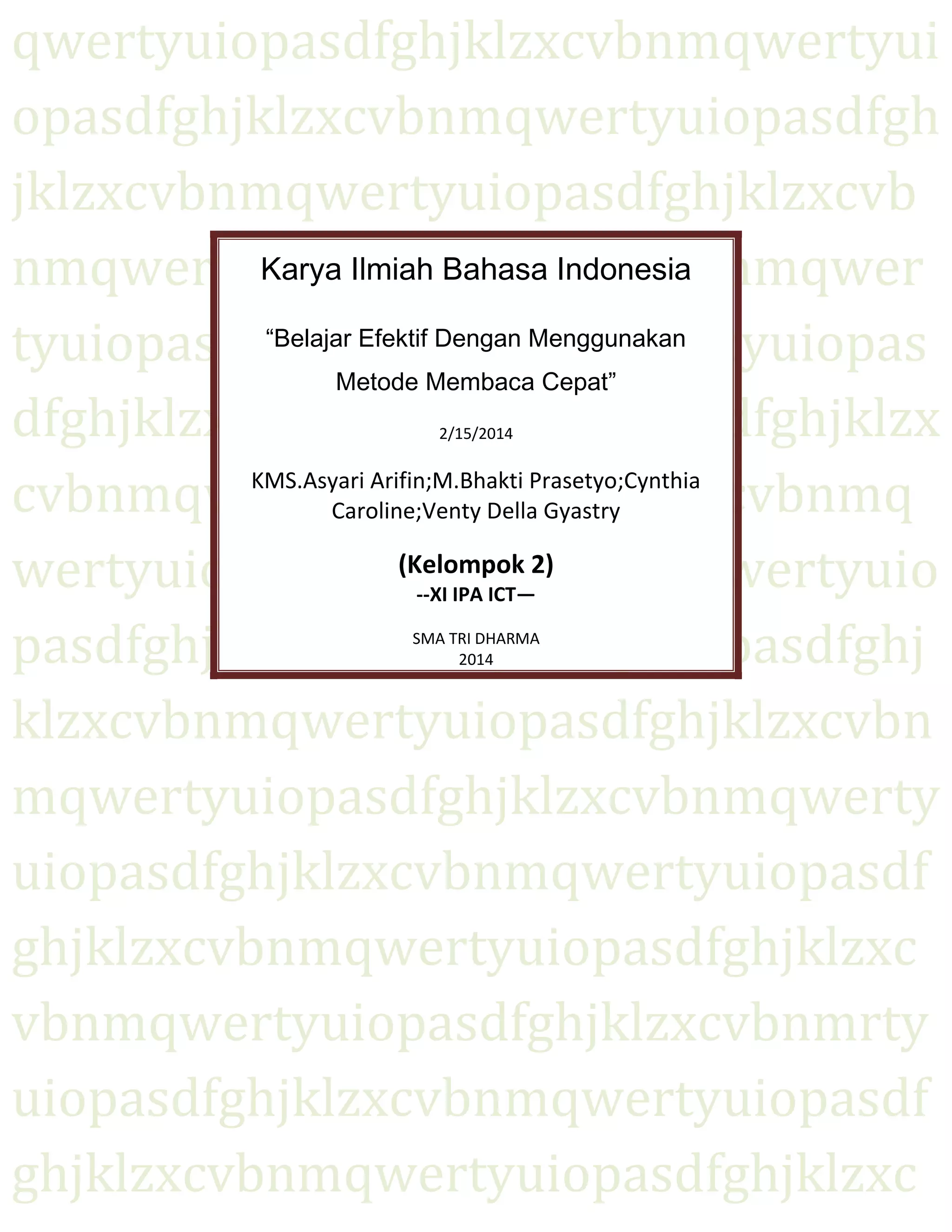Makalah ini membahas tentang cara belajar efektif dengan metode membaca cepat yang diharapkan dapat membantu siswa SMA Tri Dharma meningkatkan kemampuan membaca. Penulis mengucapkan terima kasih kepada guru dan pihak lain yang membantu dalam penyusunan makalah ini. Diharapkan karya ilmiah ini bermanfaat bagi pembaca dan menerima umpan balik untuk penyempurnaan di masa mendatang.