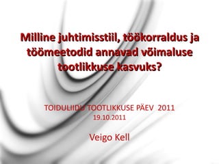 Milline juhtimisstiil, töökorraldusja töömeetodid annavad võimaluse tootlikkuse kasvuks? TOIDULIIDU TOOTLIKKUSE PÄEV 2011 19.10.2011 Veigo Kell