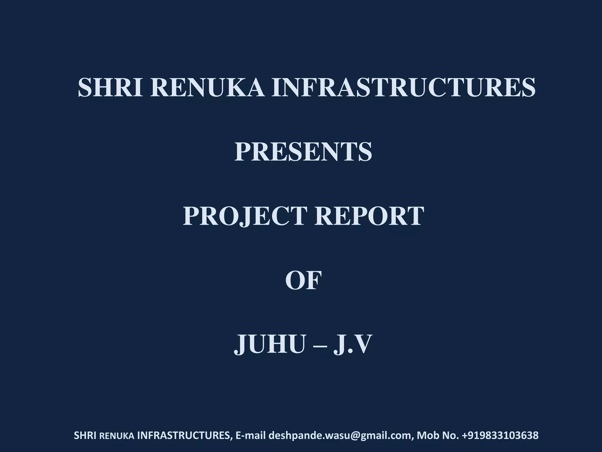 The document presents a project report by Shri Renuka Infrastructures for a development called Juhu-J.V. It provides details on the location and size of the plot of land, which is over 9,000 square meters in a residential/commercial zone. It notes the deposit required is 60 crores rupees on a 60:40 sale component ratio. Contact information is provided for Wasu A. Deshpande at Shri Renuka Infrastructures.