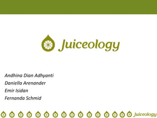This document provides information about Juiceology, a family-run juice company that has been in business for two years. It offers fruit juices with added fiber in four flavors. The target market is health-conscious adults ages 25-45 in the United States who earn over $60,000 annually. The document outlines the economic environment, company, target market, consumer personas, competition, product strategy, pricing strategy, placement strategy, promotion strategy, and SWOT analysis. The objective is to sell 2.2 million bottles in 2014 and achieve 32% contribution margin through promotional campaigns and expanding distribution.